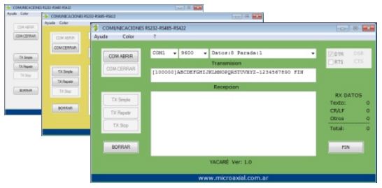 YACARÉ es un programa de aplicación destinado a la recepción y transmisión de datos asincrónicos serie. Opera en código ASCII en el formato clásico de 7 y 8 bits, puede optarse por paridad par o impar; además de seleccionar la velocidad de operacion y el puerto COM, ya se trate de un puerto fijo o de un puerto USB.